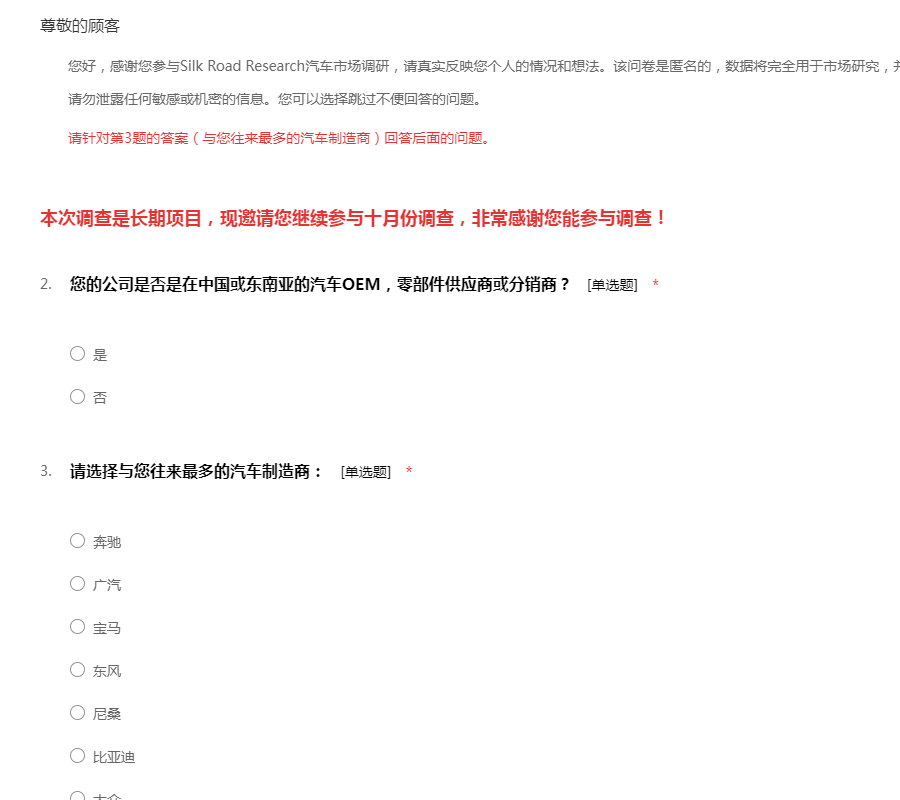 您好,感谢您参与Silk Road Research汽车市场调研,请真实反映您个人的情况和想法。该问卷是匿名的,数据将完全用于市场研究,并得到严格保密。 请勿泄露任何敏感或机密的信息。您可以选择跳过不便回答的问题。 请针对第3题的答案(与您往来最多的汽车制造商)回答后面的问题。