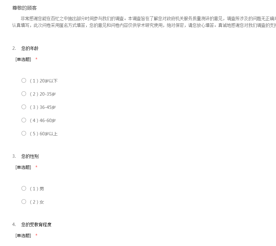 非常感谢您能在百忙之中抽出部分时间参与我们的调查。本调查旨在了解您对政府机关服务质量测评的意见,调查所涉及的问题无正确对错之分,请您根据自己的实际情况真实认真填写,此次问卷采用匿名方式填答,您的意见和问卷内容仅供学术研究使用,绝对保密,请您放心填答。真诚地感谢您对我们调查的支持与配合!
