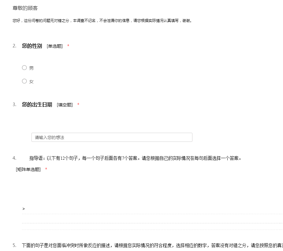 您好,这份问卷的问题无对错之分,本调查不记名,不会泄漏你的信息,请您根据实际情况认真填写,谢谢。