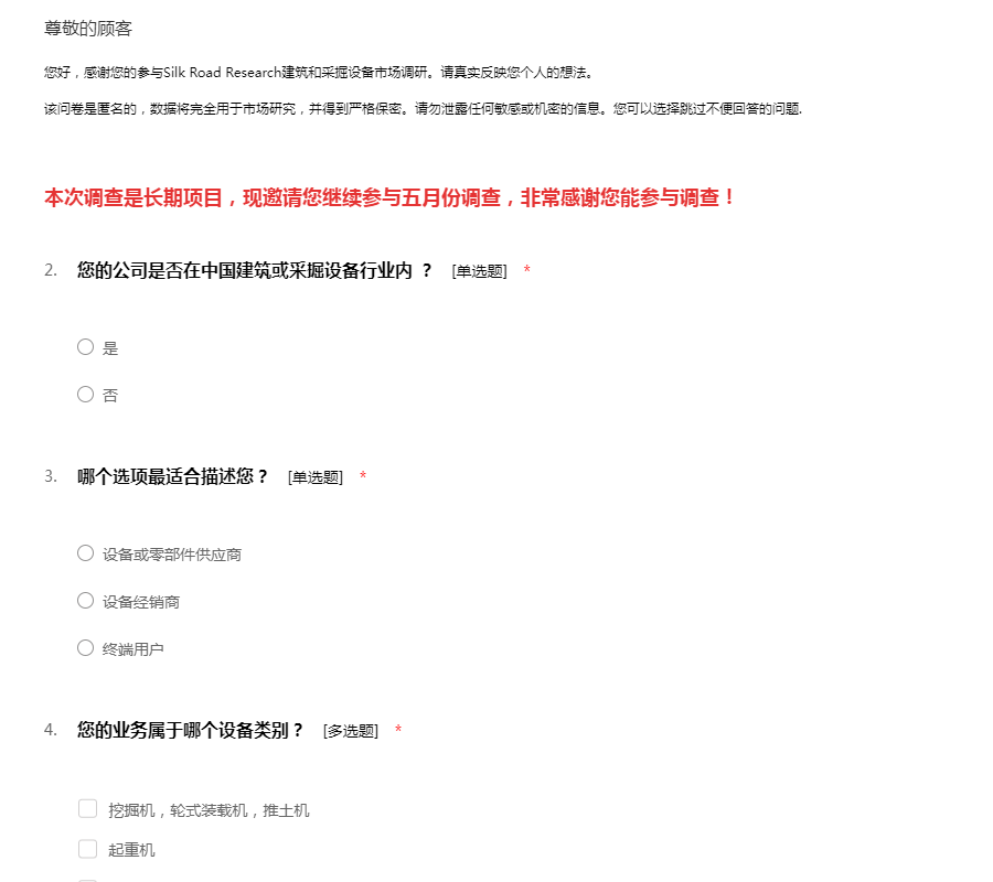 您好,感谢您的参与Silk Road Research建筑和采掘设备市场调研。请真实反映您个人的想法。 该问卷是匿名的,数据将完全用于市场研究,并得到严格保密。请勿泄露任何敏感或机密的信息。您可以选择跳过不便回答的问题.