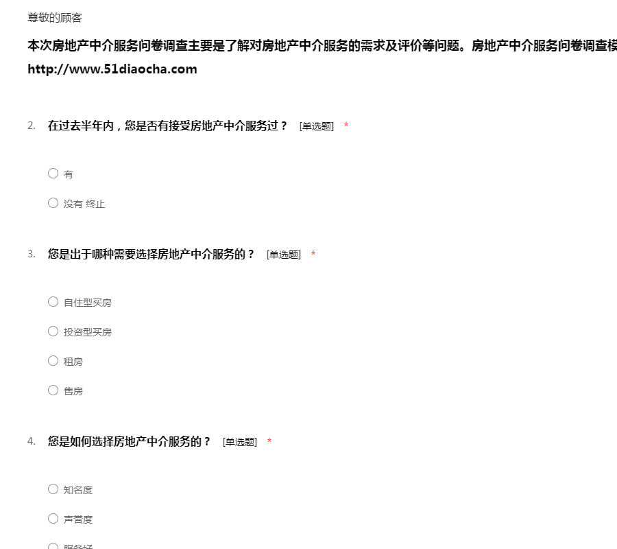 本次房地产中介服务问卷调查主要是了解对房地产中介服务的需求及评价等问题。房地产中介服务问卷调查模板是由我要调查网提供,网址: http://www.51diaocha.com