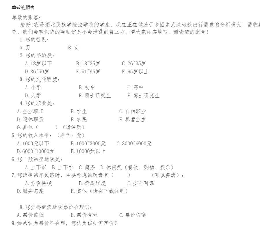 尊敬的乘客: 您好!我是湖北民族学院法学院的学生,现在正在做基于多因素武汉地铁出行需求的分析研究,需收集资料。本次调查仅用作学术研究,我们会确保您的隐私信息不会泄露到第三方,望大家如实填写。谢谢您的配合! 1.您的性别: A.男 B.女 2.您的年龄段: A.18岁以下 B.18~25岁 C.26~35岁 D.36~50岁 E.51~65岁 F.65岁以上 3.您的文化程度: A.小学 B.初中 C.高中 D.大学 E.硕士研究生 F.博士研究生 4.您的职业是: A.企业职工 B.学生 C.自由职业 D.退休职员 E.农民 F.私营业主 G.其他( )(请注明) 5.您的收入水平:(单位:元) A.1000元以下 B.1000~3000元 C.3000~6000元 D.6000~10000元 E.10000元以上 6.您一般乘坐地铁是: A.上下班 B.上下学 C.商务 D.休闲类(餐饮、购物、娱乐) 7.您选择乘车线路时,主要考虑的因素有( ) (可以多选): A.方便快捷 B.舒适程度 C.安全可靠 D.服务态度 E.其他(请在下线注明) 8.您觉得武汉地铁票价合理吗: A.票价偏低 B.票价合理 C.票价偏高 9.如果认为票价不合理,您认为该如何定价? 10.您对未来地铁的发展,包括票价,服务,设施等有哪些建议: 感谢您的合作,愿您生活工作愉快!