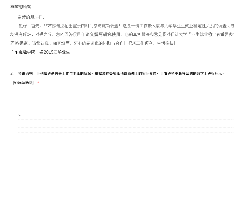 亲爱的朋友们, 您好!首先,非常感谢您抽出宝贵的时间参与此项调查!这是一份工作嵌入度与大学毕业生就业稳定性关系的调查问卷。本调查采用匿名方式,所得数据均没有好坏、对错之分,您的回答仅用作论文撰写研究使用。您的真实想法和意见将对促进大学毕业生就业稳定有重要参考价值,我们承诺对您所填写的资料严格保密。请您认真、如实填写。衷心的感谢您的协助与合作!祝您工作顺利,生活愉快! 广东金融学院一名2015届毕业生