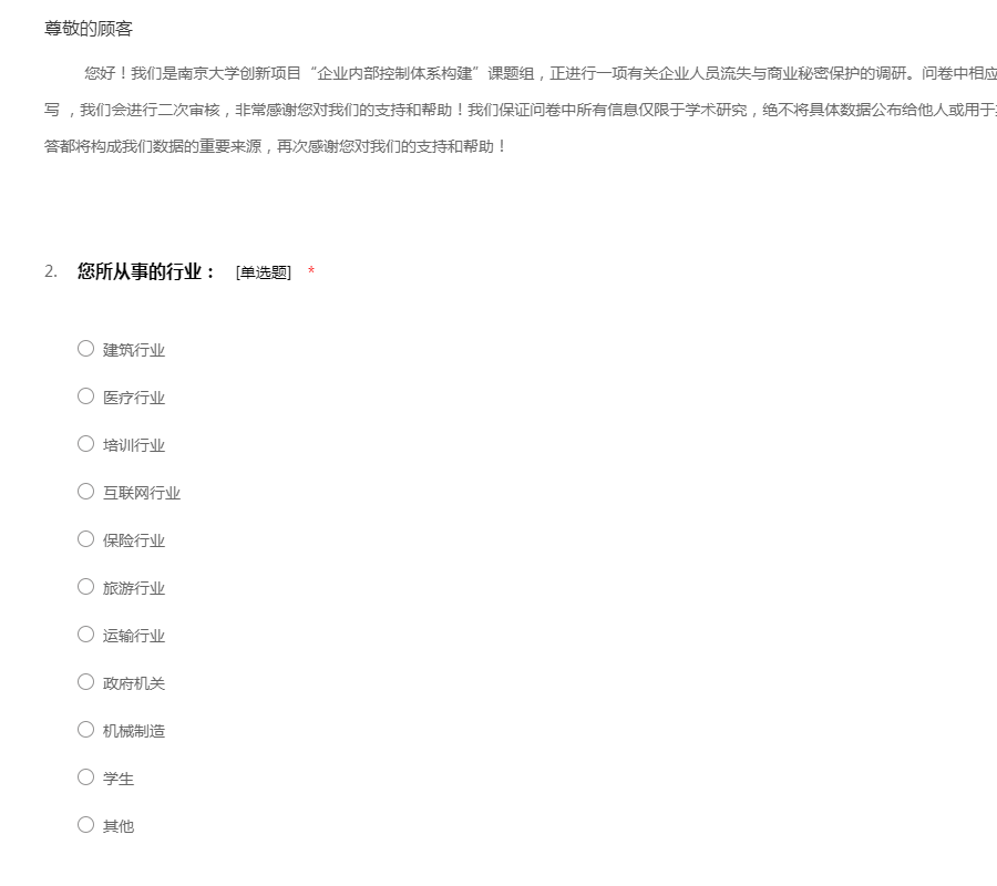 您好!我们是南京大学创新项目“企业内部控制体系构建”课题组,正进行一项有关企业人员流失与商业秘密保护的调研。问卷中相应行业对应类型的企业名称请核对正确再填写 ,我们会进行二次审核,非常感谢您对我们的支持和帮助!我们保证问卷中所有信息仅限于学术研究,绝不将具体数据公布给他人或用于其他用途,请您放心填写。您的每一个解答都将构成我们数据的重要来源,再次感谢您对我们的支持和帮助!