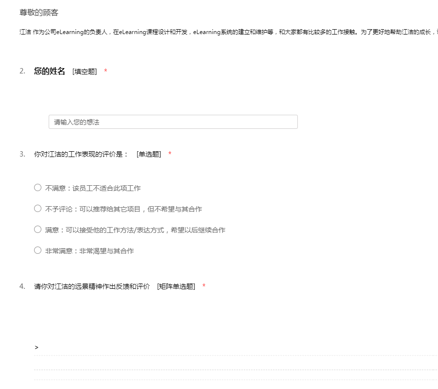 江洁 作为公司eLearning的负责人,在eLearning课程设计和开发,eLearning系统的建立和维护等,和大家都有比较多的工作接触。为了更好地帮助江洁的成长,请大家对她的工作给与反馈和评价