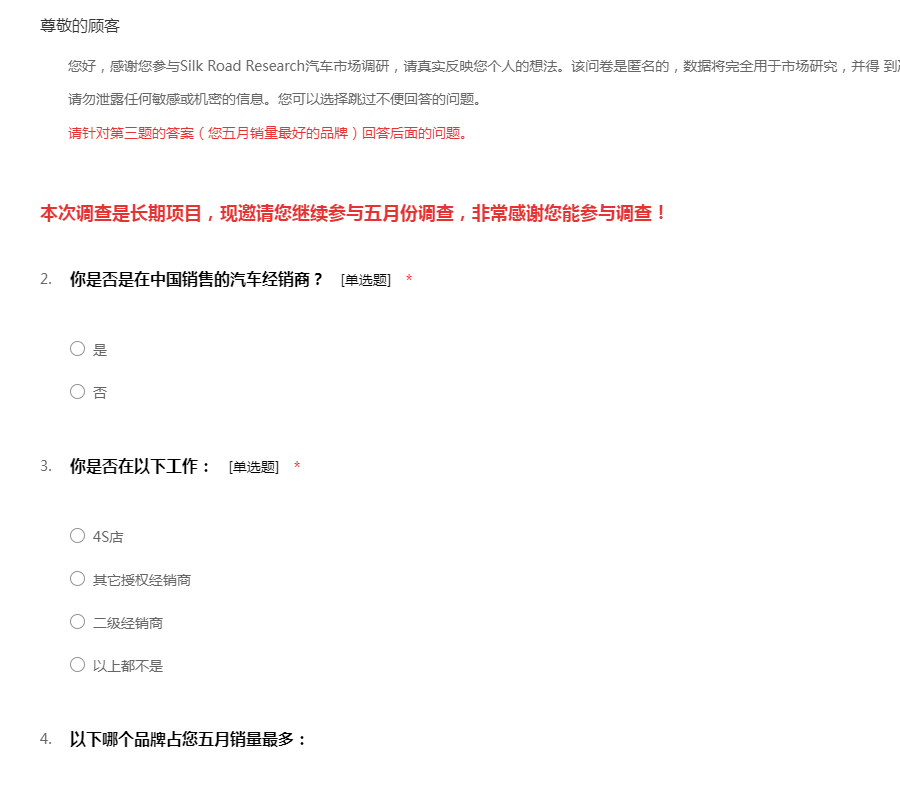 您好,感谢您参与Silk Road Research汽车市场调研,请真实反映您个人的想法。该问卷是匿名的,数据将完全用于市场研究,并得 到严格保密。 请勿泄露任何敏感或机密的信息。您可以选择跳过不便回答的问题。 请针对第三题的答案(您五月销量最好的品牌)回答后面的问题。
