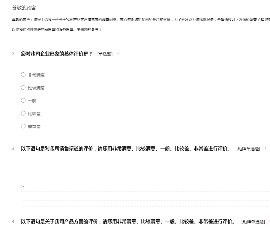 尊敬的客户:您好!这是一份关于我司产品客户满意度的调查问卷。衷心感谢您对我司的关注和支持,为了更好地为您提供服务,希望通过以下方面的调查了解 您对我们公司产品及服务质量的真实看法与评价,以便我们持续改进产品质量和服务质量。感谢您的参与!