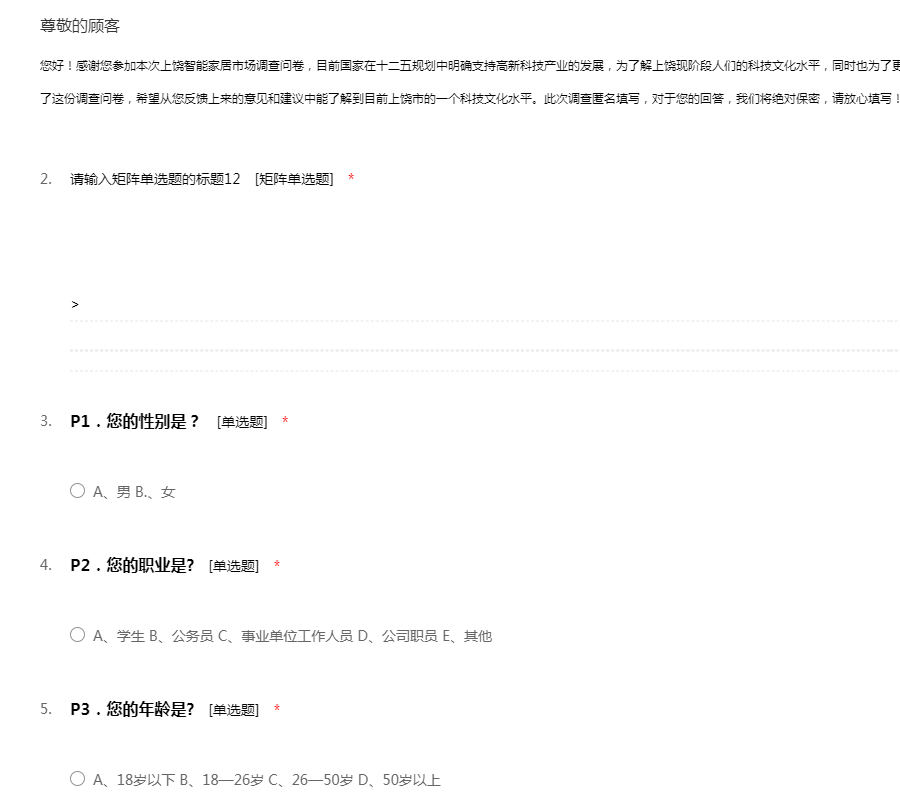 您好!感谢您参加本次上饶智能家居市场调查问卷,目前国家在十二五规划中明确支持高新科技产业的发展,为了解上饶现阶段人们的科技文化水平,同时也为了更好的促进我们上饶市整体经济的发展,我们设计了这份调查问卷,希望从您反馈上来的意见和建议中能了解到目前上饶市的一个科技文化水平。此次调查匿名填写,对于您的回答,我们将绝对保密,请放心填写!谢谢您的合作!