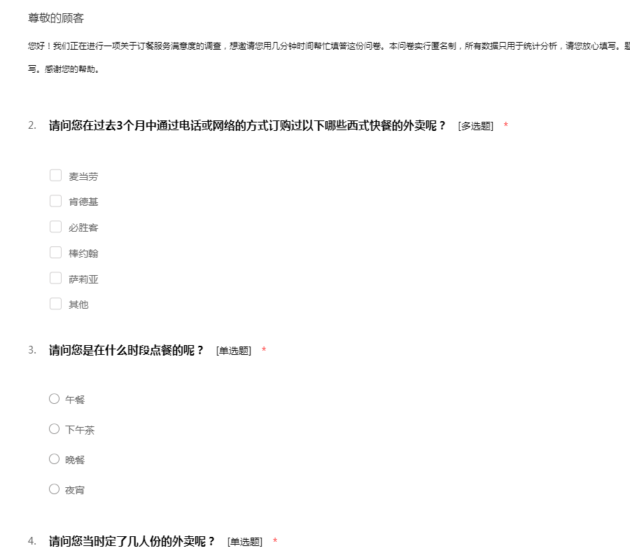 您好!我们正在进行一项关于订餐服务满意度的调查,想邀请您用几分钟时间帮忙填答这份问卷。本问卷实行匿名制,所有数据只用于统计分析,请您放心填写。题目选项无对错之分,请您按自己的实际情况填写。感谢您的帮助。