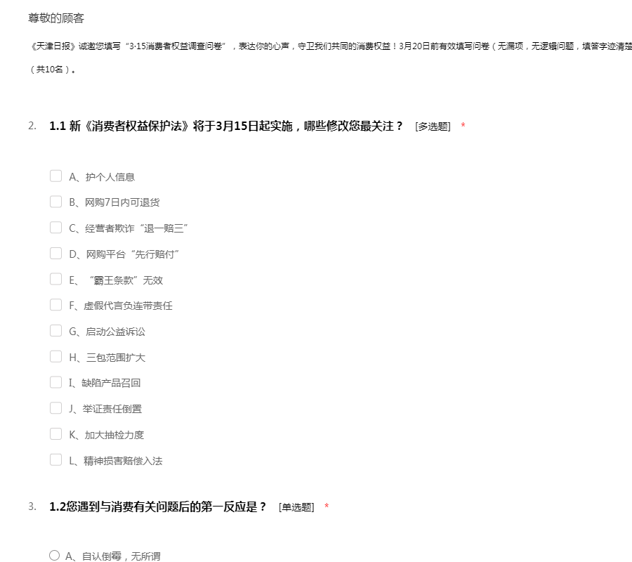 《天津日报》诚邀您填写“3·15消费者权益调查问卷”,表达你的心声,守卫我们共同的消费权益!3月20日前有效填写问卷(无漏项,无逻辑问题,填答字迹清楚),并及时反馈的读者,均有机会获得精美礼品(共10名)。