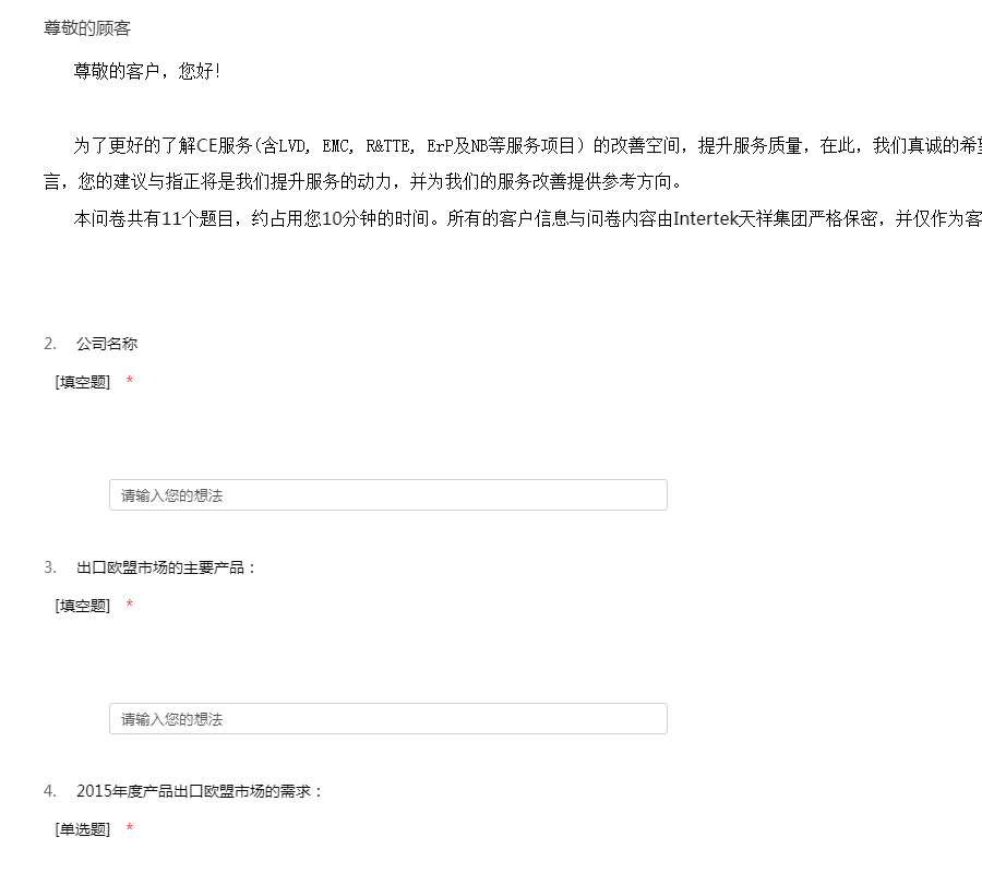 尊敬的客户,您好! 为了更好的了解CE服务(含LVD, EMC, R&TTE, ErP及NB等服务项目)的改善空间,提升服务质量,在此,我们真诚的希望听到您对我司服务的真实评价与建言,您的建议与指正将是我们提升服务的动力,并为我们的服务改善提供参考方向。 本问卷共有11个题目,约占用您10分钟的时间。所有的客户信息与问卷内容由Intertek天祥集团严格保密,并仅作为客户满意度调查所用。