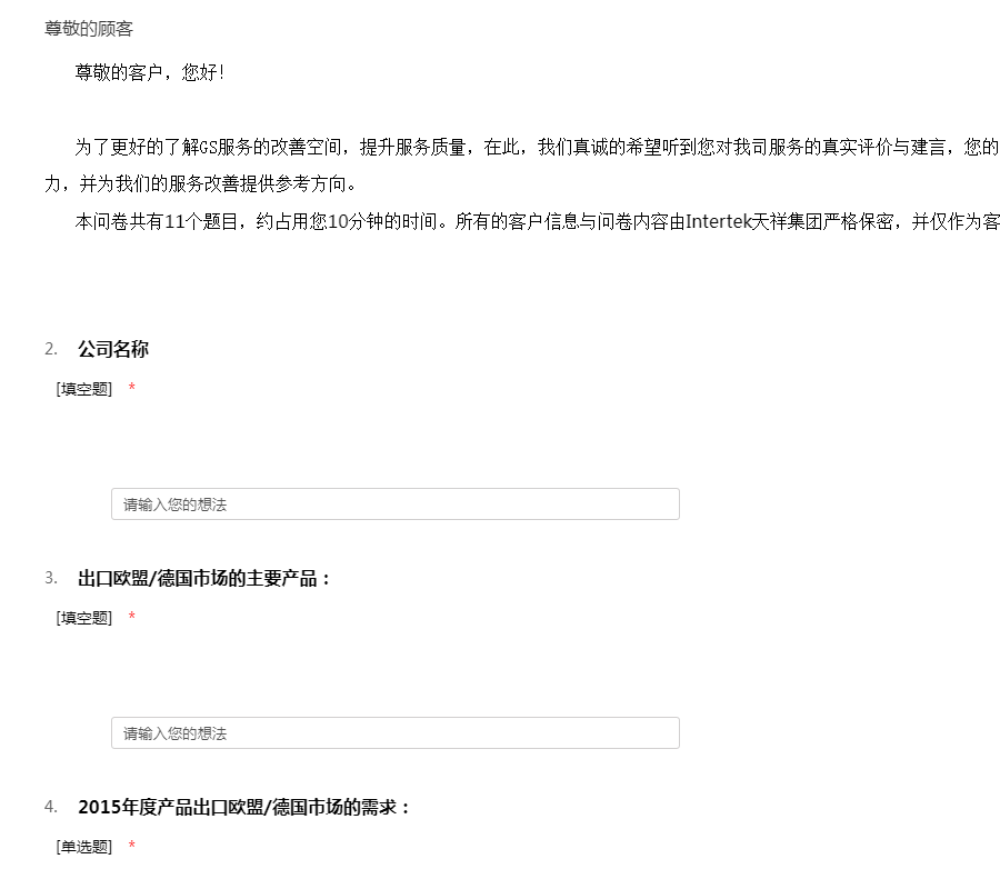 尊敬的客户,您好! 为了更好的了解GS服务的改善空间,提升服务质量,在此,我们真诚的希望听到您对我司服务的真实评价与建言,您的建议与指正将是我们提升服务的动力,并为我们的服务改善提供参考方向。 本问卷共有11个题目,约占用您10分钟的时间。所有的客户信息与问卷内容由Intertek天祥集团严格保密,并仅作为客户满意度调查所用。