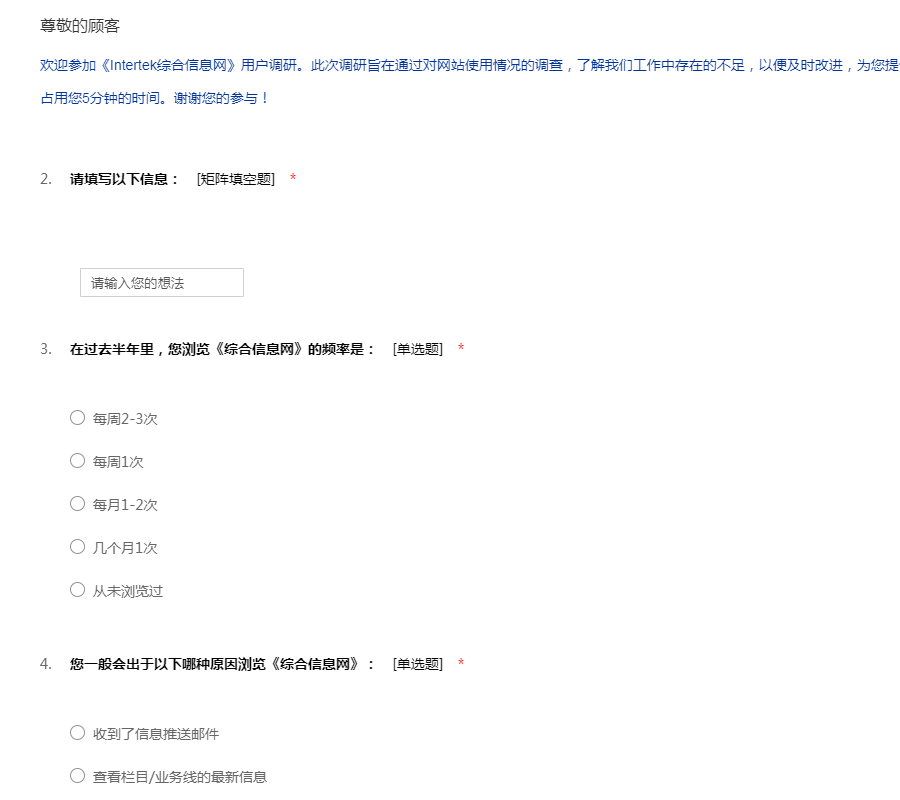 欢迎参加《Intertek综合信息网》用户调研。此次调研旨在通过对网站使用情况的调查,了解我们工作中存在的不足,以便及时改进,为您提供更好的服务。本问卷共有15道题目,约占用您5分钟的时间。谢谢您的参与!