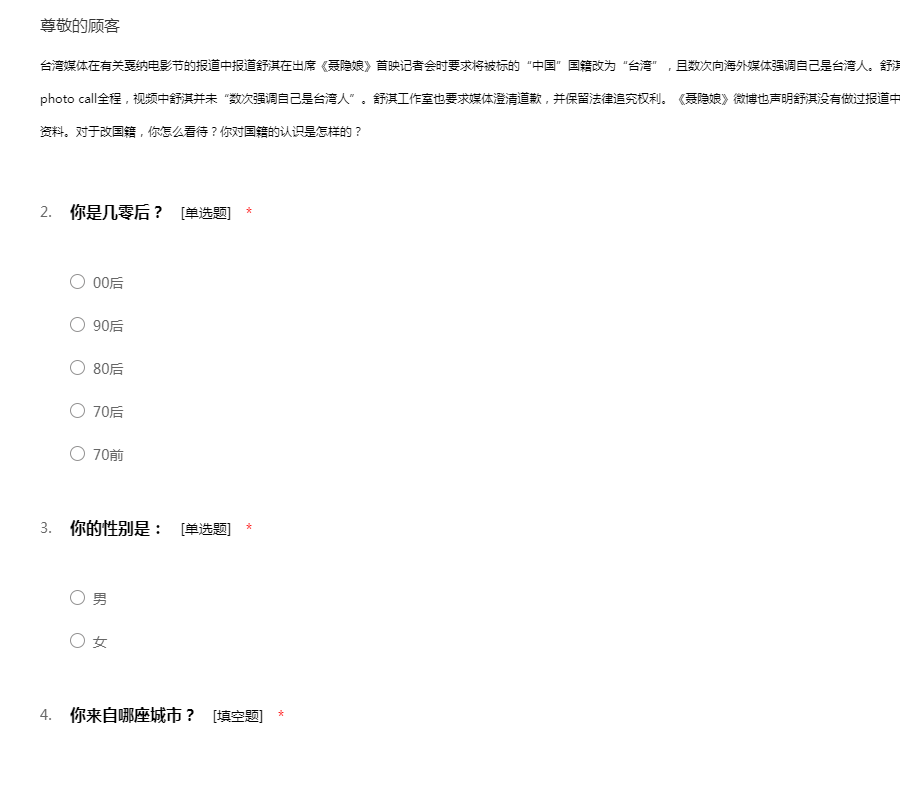 台湾媒体在有关戛纳电影节的报道中报道舒淇在出席《聂隐娘》首映记者会时要求将被标的“中国”国籍改为“台湾”,且数次向海外媒体强调自己是台湾人。舒淇经纪人在微博上表示否认,并转发了舒淇等人的photo call全程,视频中舒淇并未“数次强调自己是台湾人”。舒淇工作室也要求媒体澄清道歉,并保留法律追究权利。《聂隐娘》微博也声明舒淇没有做过报道中的事,主创绝没接触过“剧组演员名单图片”等资料。对于改国籍,你怎么看待?你对国籍的认识是怎样的?