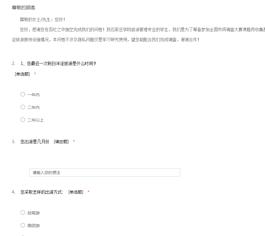 尊敬的女士/先生:您好! 您好,感谢您在百忙之中抽空完成我们的问卷!我石家庄学院旅游管理专业的学生,我们是为了筹备参加全国市场调查大赛课题而收集基础数据。本调查的主题是了解目前白洋淀旅游接待设施情况,本问卷不涉及隐私问题仅是学习研究使用,望您能配合我们完成调查,谢谢合作!