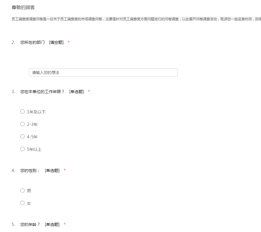 员工满意度调查问卷是一份关于员工满意度的市场调查问卷,主要是针对员工满意度方面问题进行的问卷调查,以此展开问卷调查活动,耽误您一些宝贵时间,回答 员工满意度调查问卷,谢谢您的合作。