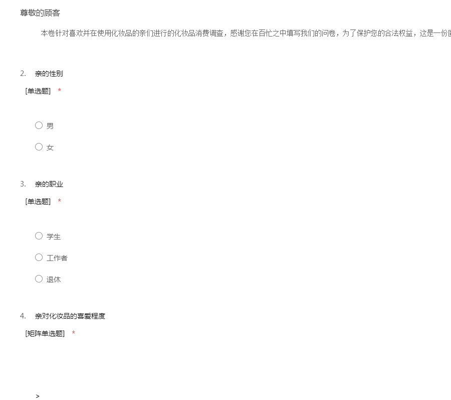本卷针对喜欢并在使用化妆品的亲们进行的化妆品消费调查,感谢您在百忙之中填写我们的问卷,为了保护您的合法权益,这是一份匿名问卷,仅作分析调研哦~