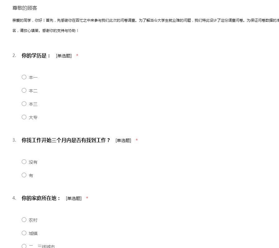 亲爱的同学,你好!首先,先感谢你在百忙之中来参与我们此次的问卷调查。为了解当今大学生就业难的问题,我们特此设计了这份调查问卷。为保证问卷数据的准确性,请务必要根据实际情况填写。问卷不记名,请放心填答。感谢你的支持与协助!
