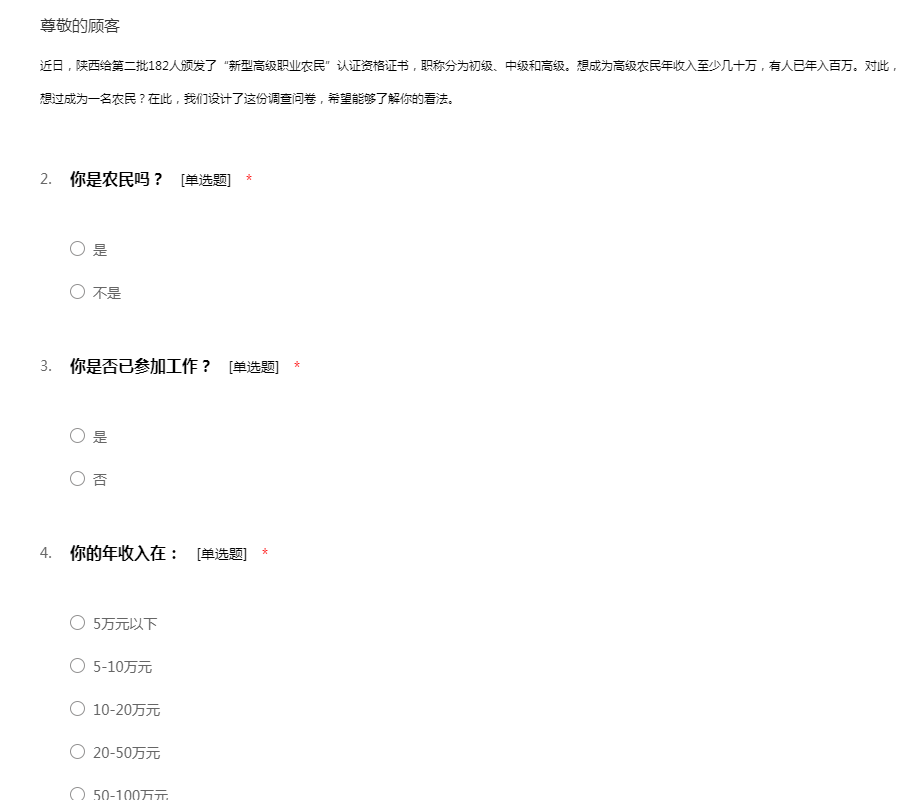 近日,陕西给第二批182人颁发了“新型高级职业农民”认证资格证书,职称分为初级、中级和高级。想成为高级农民年收入至少几十万,有人已年入百万。对此,你怎么看?你对农民的看法是怎样的?你是否有想过成为一名农民?在此,我们设计了这份调查问卷,希望能够了解你的看法。