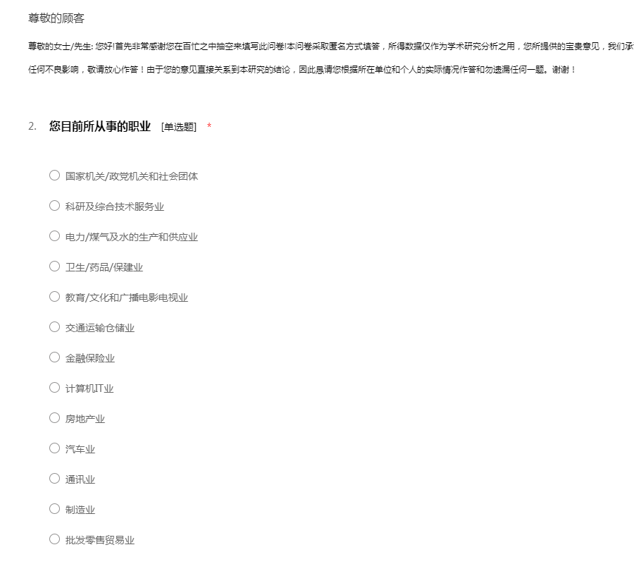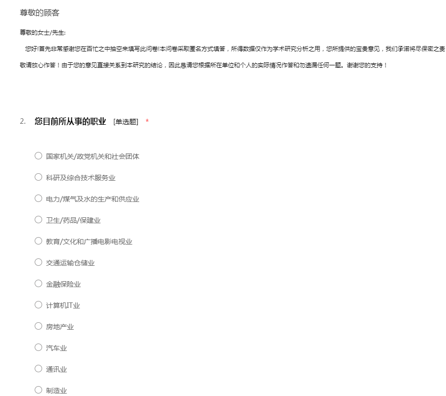 尊敬的女士/先生: 您好!首先非常感谢您在百忙之中抽空来填写此问卷!本问卷采取匿名方式填答,所得数据仅作为学术研究分析之用,您所提供的宝贵意见,我们承诺将尽保密之责,不会对您个人及所在公司造成任何不良影响,敬请放心作答!由于您的意见直接关系到本研究的结论,因此恳请您根据所在单位和个人的实际情况作答和勿遗漏任何一题。谢谢!