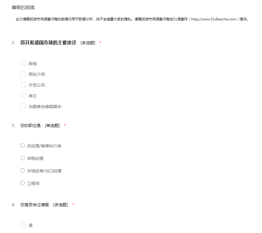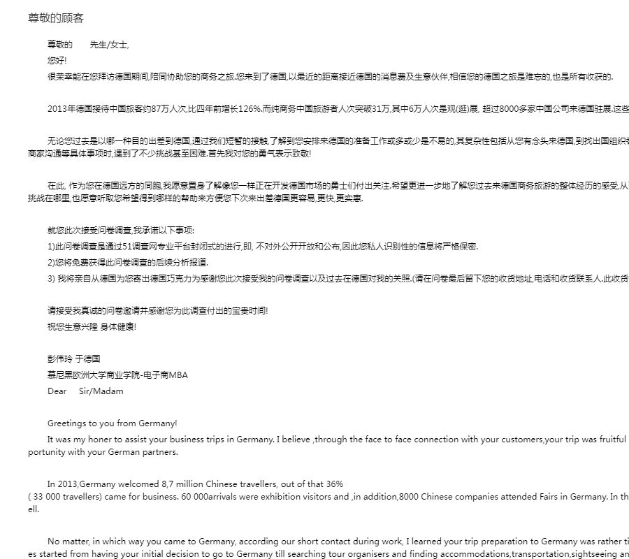 在此, 作为您在德国远方的同胞,我愿意置身了解像您一样正在开发德国市场的勇士们付出关注.希望更进一步地了解您过去来德国商务旅游的整体经历的感受,从而分析来德国的商务之旅的实事现状,具体困难或挑战在哪里,也愿意听取您希望得到哪样的帮助来方便您下次来出差德国更容易,更快,更实惠.