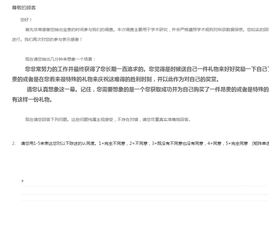 首先非常感谢您抽出宝贵的时间参与我们的调查。本次调查主要用于学术研究,并会严格遵照学术规则对所获数据保密。您如实的回答和耐心的合作将直接有利于我们研究的进行。我们再次对您的参与表示感谢!