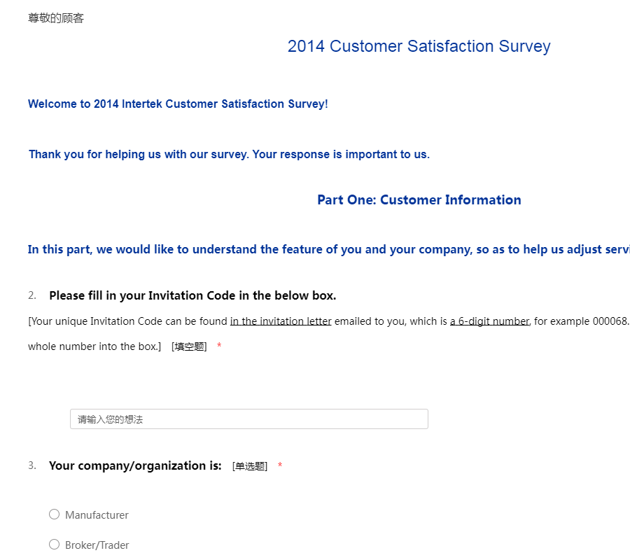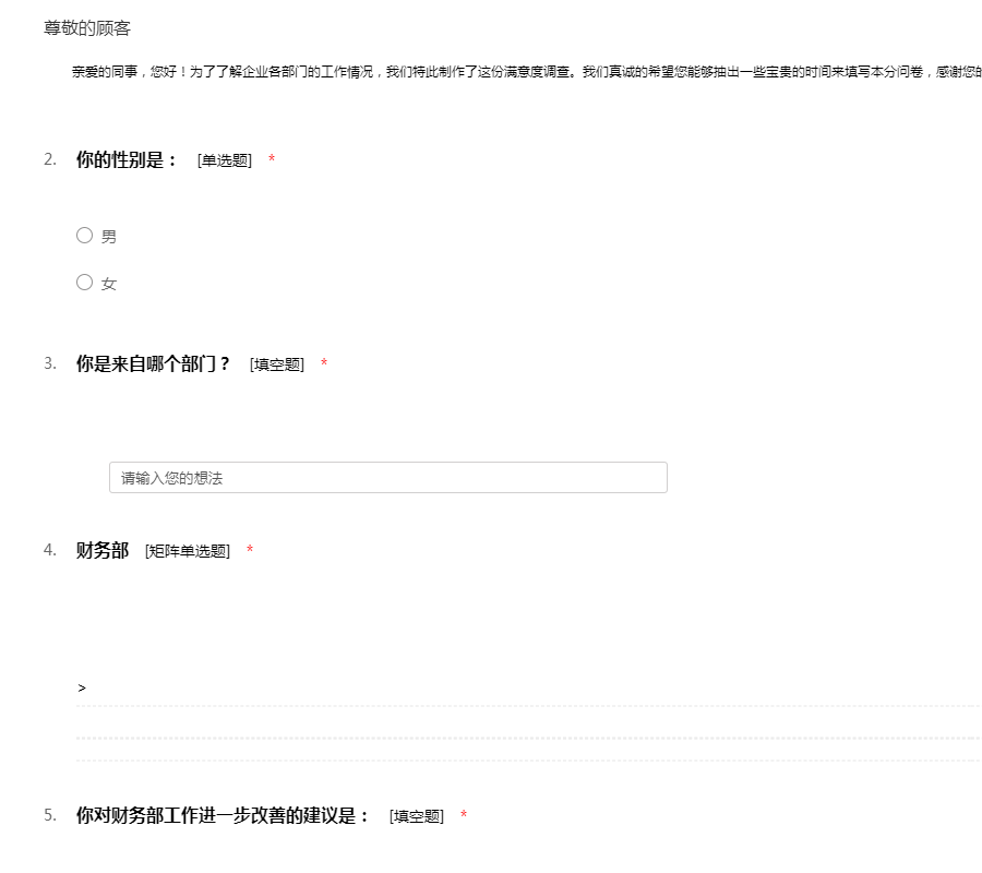 ——亲爱的同事,您好!为了了解企业各部门的工作情况,我们特此制作了这份满意度调查。我们真诚的希望您能够抽出一些宝贵的时间来填写本分问卷,感谢您的参与!