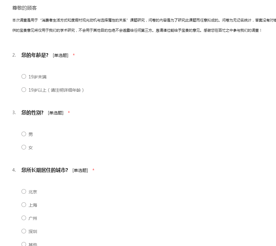 本次调查是用于“消费者生活方式和度假村观光动机与选择属性的关系”课题研究,问卷的内容是为了研究此课题而任意拟成的。问卷为无记名统计,答案没有对错之分。希望您仔细的阅读问卷并诚实回答。您提供的宝贵意见将仅用于我们的学术研究,不会用于其他目的也绝不会透露给任何第三方。恳请诸位能给予宝贵的意见。感谢您在百忙之中参与我们的调查!