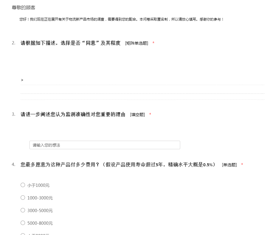 ——您好!我们现在正在展开有关于物流新产品市场的调查,需要得到您的配合。本问卷采取匿名制,所以请放心填写。感谢你的参与!