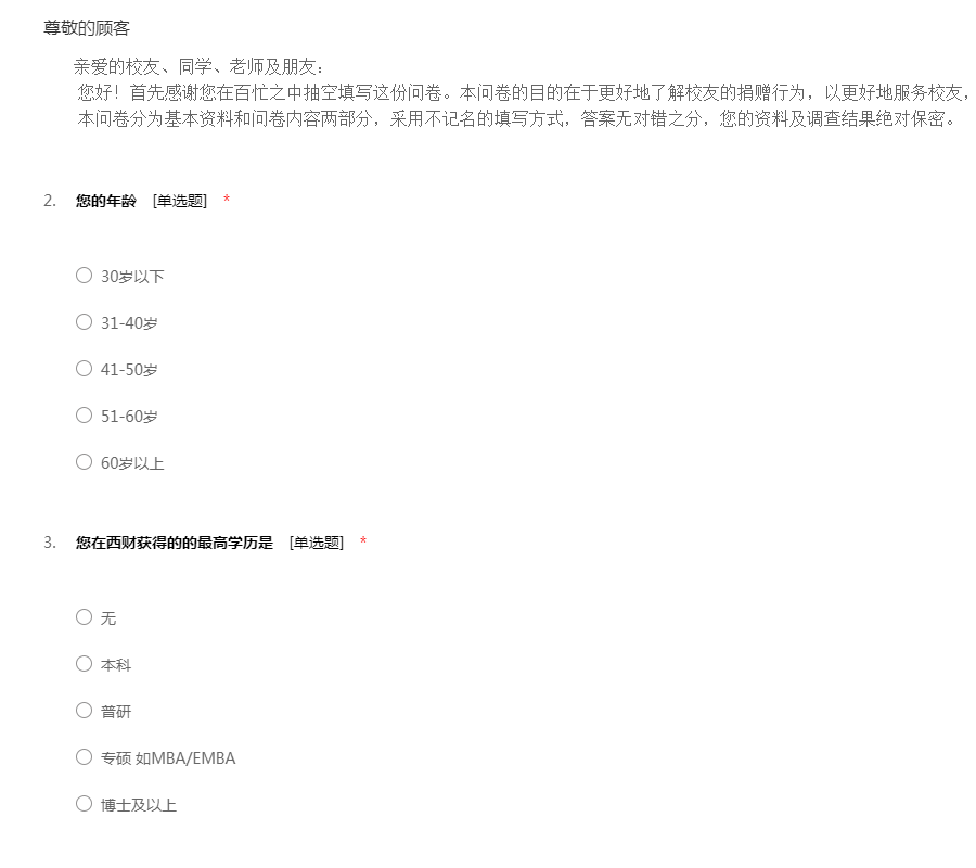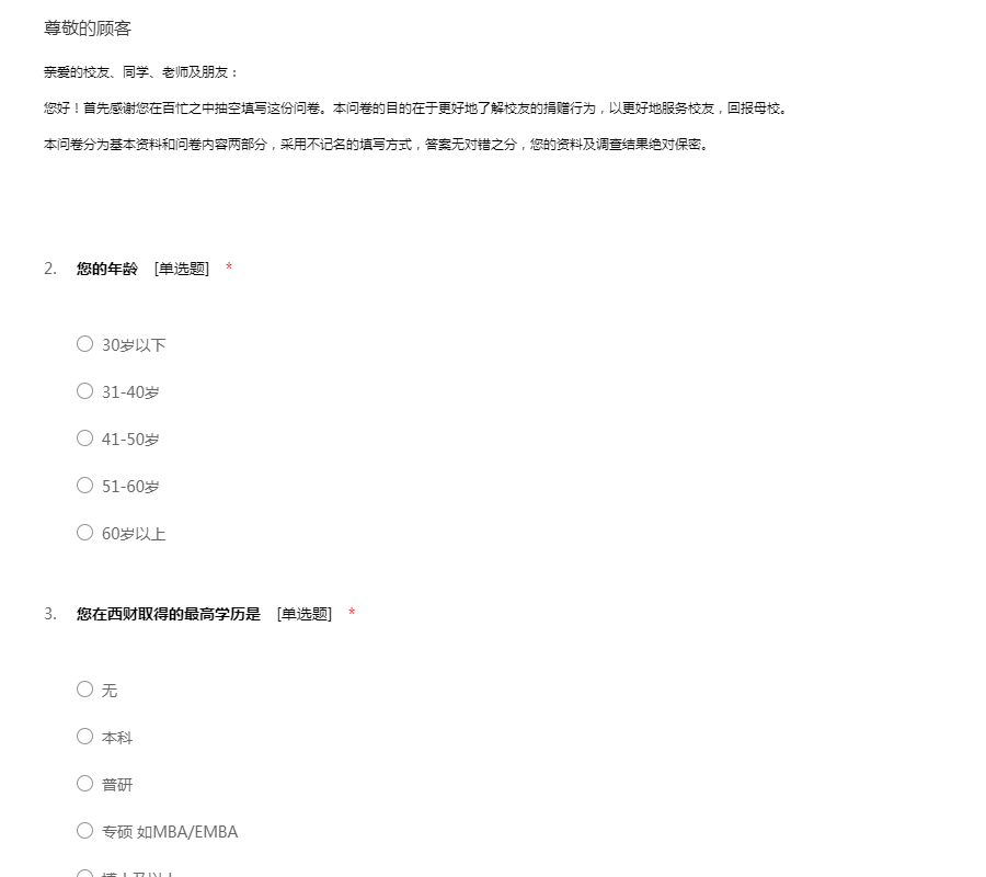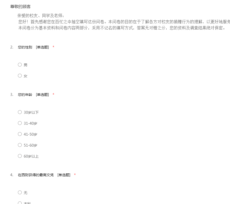 亲爱的校友、同学、老师及朋友: 您好!首先感谢您在百忙之中抽空填写这份问卷。本问卷的目的在于更好地了解校友的捐赠行为,以更好地服务校友,回报母校。 本问卷分为基本资料和问卷内容两部分,采用不记名的填写方式,答案无对错之分,您的资料及调查结果绝对保密。