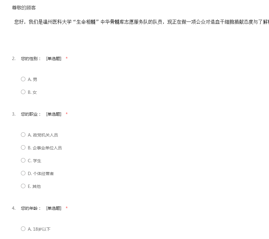 您好,我们是温州医科大学“生命相髓”中华骨髓库志愿服务队的队员,现正在做一项公众对造血干细胞捐献态度与了解程度的社会调研,感谢您的支持。
