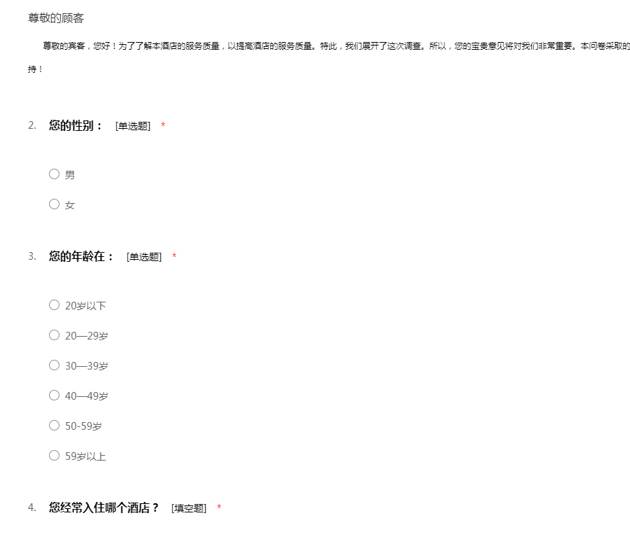 尊敬的宾客,您好!为了了解本酒店的服务质量,以提高酒店的服务质量。特此,我们展开了这次调查。所以,您的宝贵意见将对我们非常重要。本问卷采取的是不记名方式,所以请放心填答。感谢您的支持!