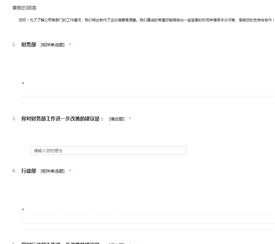 您好!为了了解公司各部门的工作情况,我们特此制作了这份满意度调查。我们真诚的希望您能够抽出一些宝贵的时间来填写本分问卷,感谢您的支持与合作!