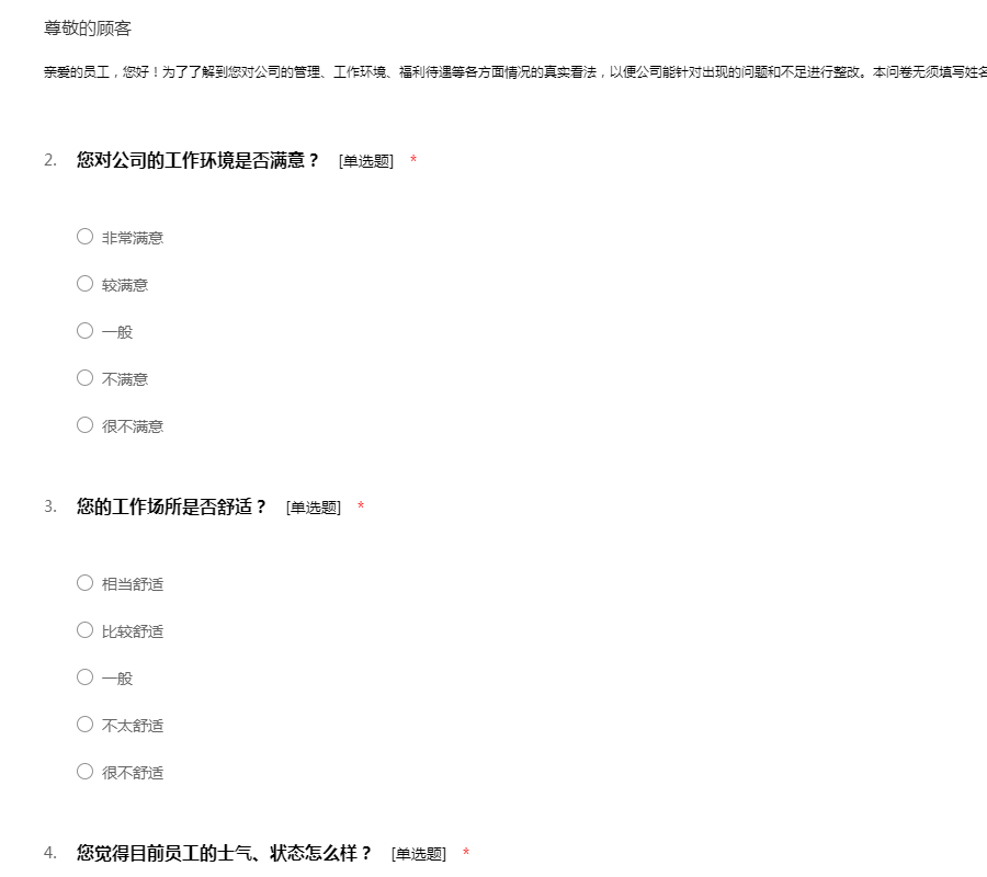 亲爱的员工,您好!为了了解到您对公司的管理、工作环境、福利待遇等各方面情况的真实看法,以便公司能针对出现的问题和不足进行整改。本问卷无须填写姓名,所以请放心的如实填写。感谢您的支持!