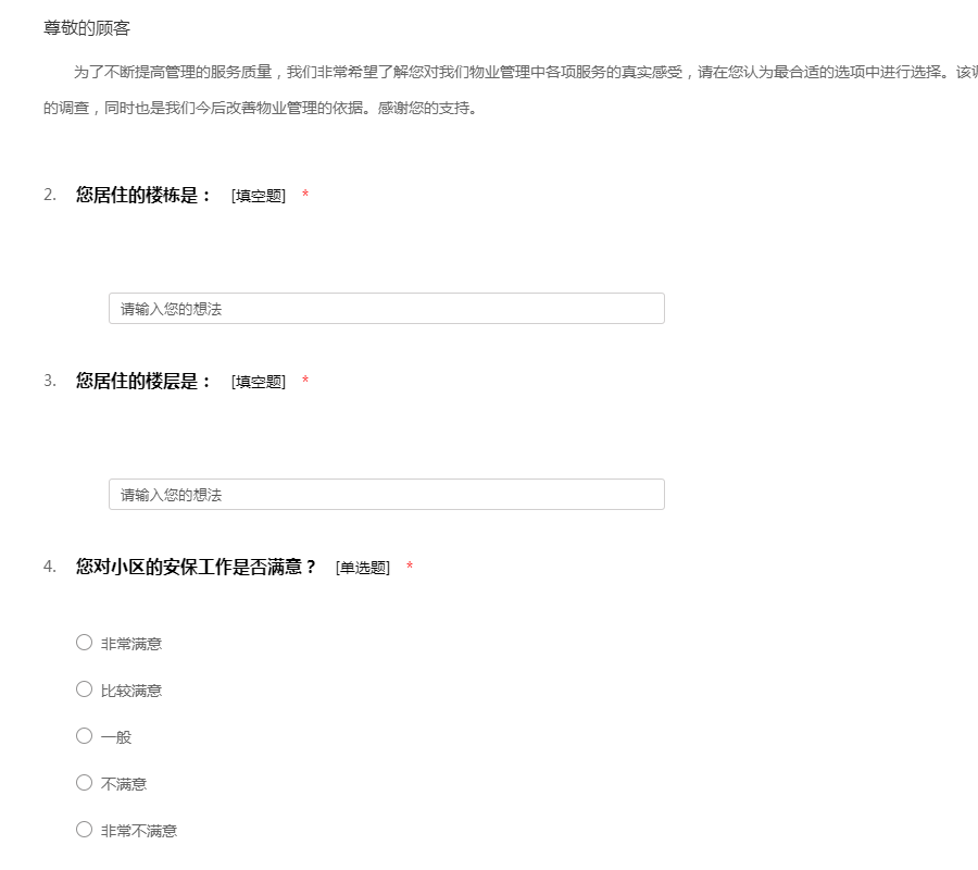 为了不断提高管理的服务质量,我们非常希望了解您对我们物业管理中各项服务的真实感受,请在您认为最合适的选项中进行选择。该调查是我公司对物业管理工作满意度进行的调查,同时也是我们今后改善物业管理的依据。感谢您的支持。