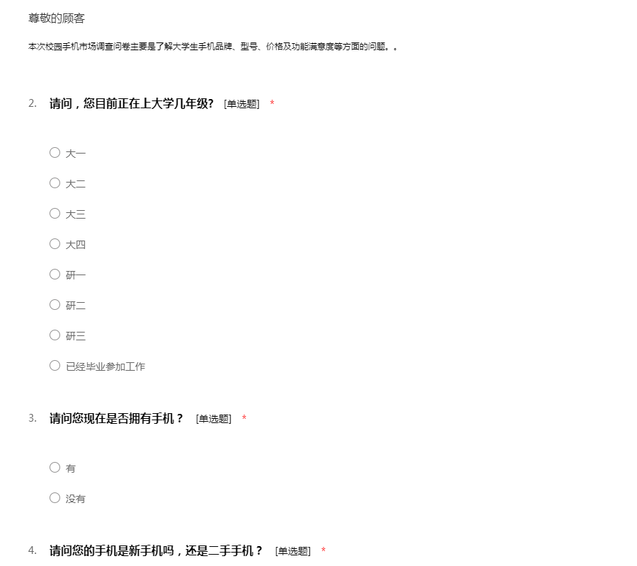本次校园手机市场调查问卷主要是了解大学生手机品牌、型号、价格及功能满意度等方面的问题。。