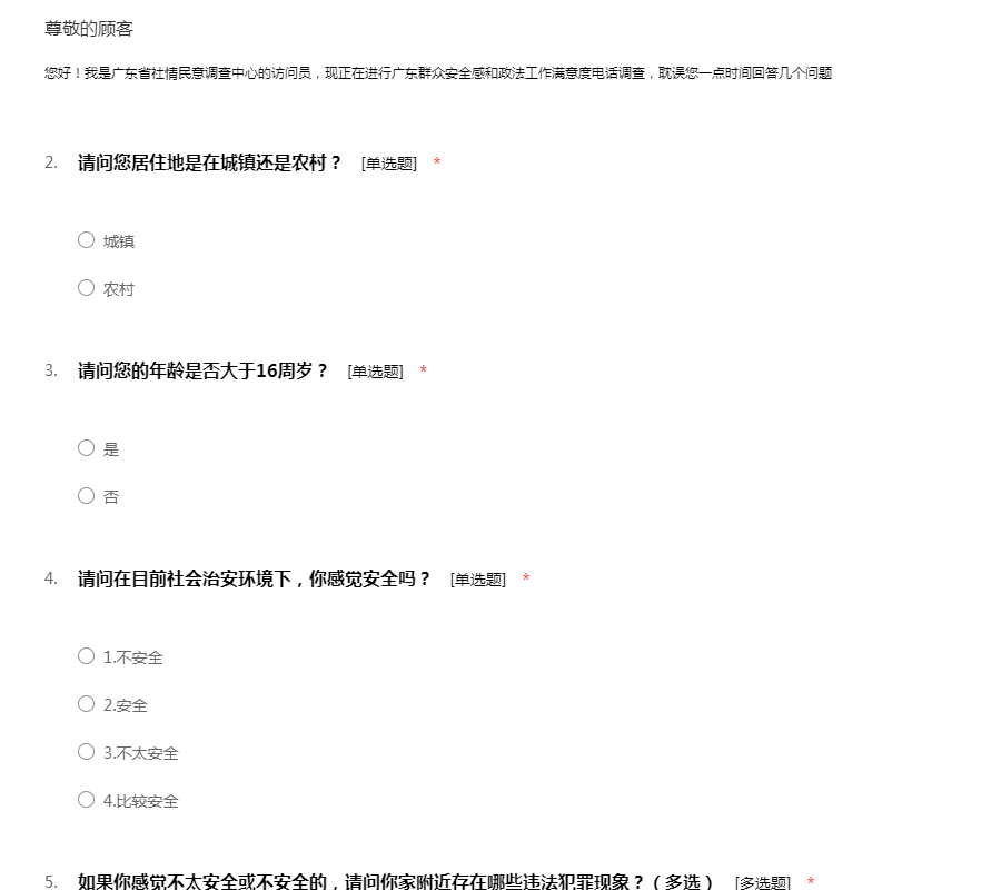 您好!我是广东省社情民意调查中心的访问员,现正在进行广东群众安全感和政法工作满意度电话调查,耽误您一点时间回答几个问题