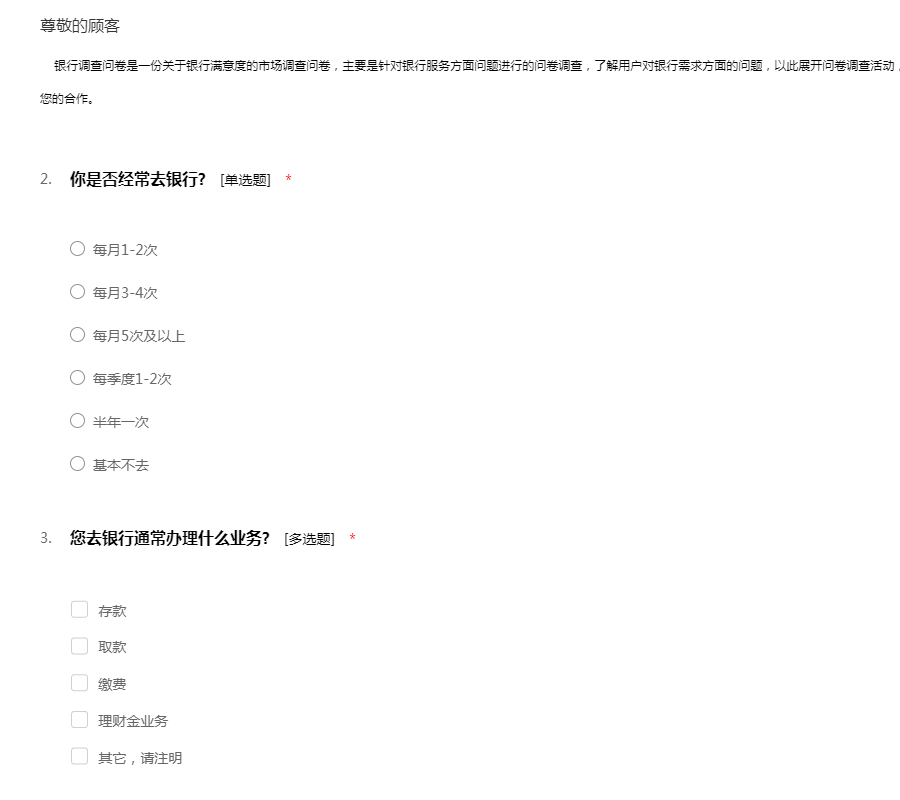 银行调查问卷是一份关于银行满意度的市场调查问卷,主要是针对银行服务方面问题进行的问卷调查,了解用户对银行需求方面的问题,以此展开问卷调查活动,耽误您一些宝贵时间,回答我们的问题,谢谢您的合作。