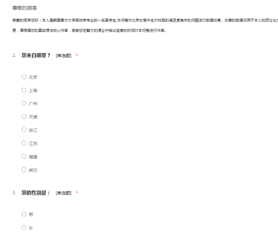 亲爱的同学您好:本人是韩国首尔大学服饰学专业的一名留学生,本问卷对北京女高中生对校服的满足度有关的问题进行数据收集,收集的数据仅用于本人的硕士论文中,您的参与完全匿名,不涉及任何隐私信息,请根据您的真实想法放心作答,感谢您在繁忙的课业中抽出宝贵的时间对本问卷进行作答。