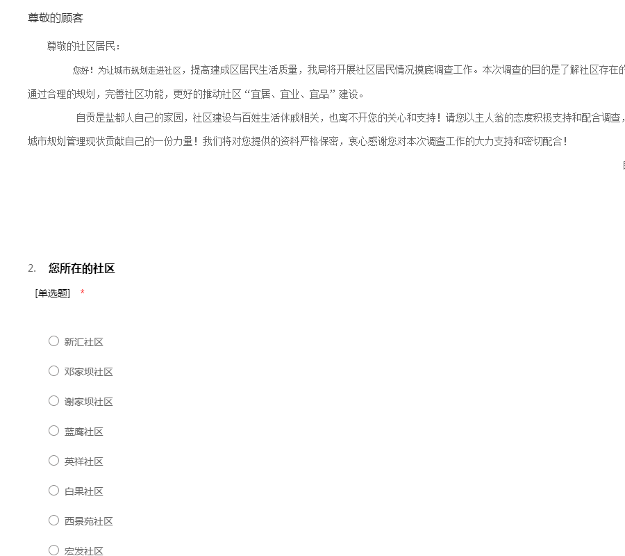 您好!为让城市规划走进社区,提高建成区居民生活质量,我局将开展社区居民情况摸底调查工作。本次调查的目的是了解社区存在的问题、听取大家对社区发展的建议意见,通过合理的规划,完善社区功能,更好的推动社区“宜居、宜业、宜品”建设。