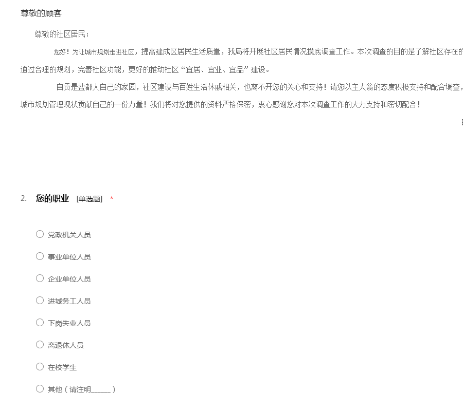 您好!为让城市规划走进社区,提高建成区居民生活质量,我局将开展社区居民情况摸底调查工作。本次调查的目的是了解社区存在的问题、听取大家对社区发展的建议意见,通过合理的规划,完善社区功能,更好的推动社区“宜居、宜业、宜品”建设。