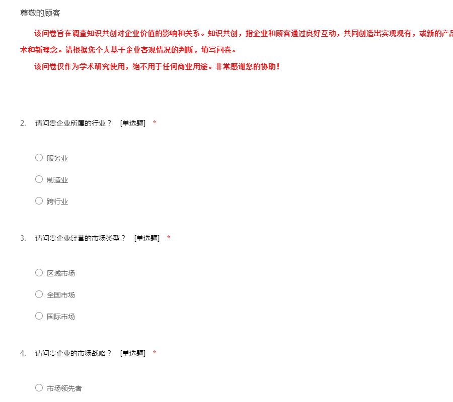 该问卷旨在调查知识共创对企业价值的影响和关系。知识共创,指企业和顾客通过良好互动,共同创造出实现现有,或新的产品、服务、模式所需要的新知识、新技术和新理念。请根据您个人基于企业客观情况的判断,填写问卷。 该问卷仅作为学术研究使用,绝不用于任何商业用途。非常感谢您的协助!