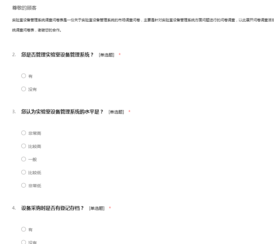 实验室设备管理系统调查问卷表是一份关于实验室设备管理系统的市场调查问卷,主要是针对实验室设备管理系统方面问题进行的问卷调查,以此展开问卷调查活动,耽误您一些宝贵时间,回答实验室设备管理系统调查问卷表,谢谢您的合作。