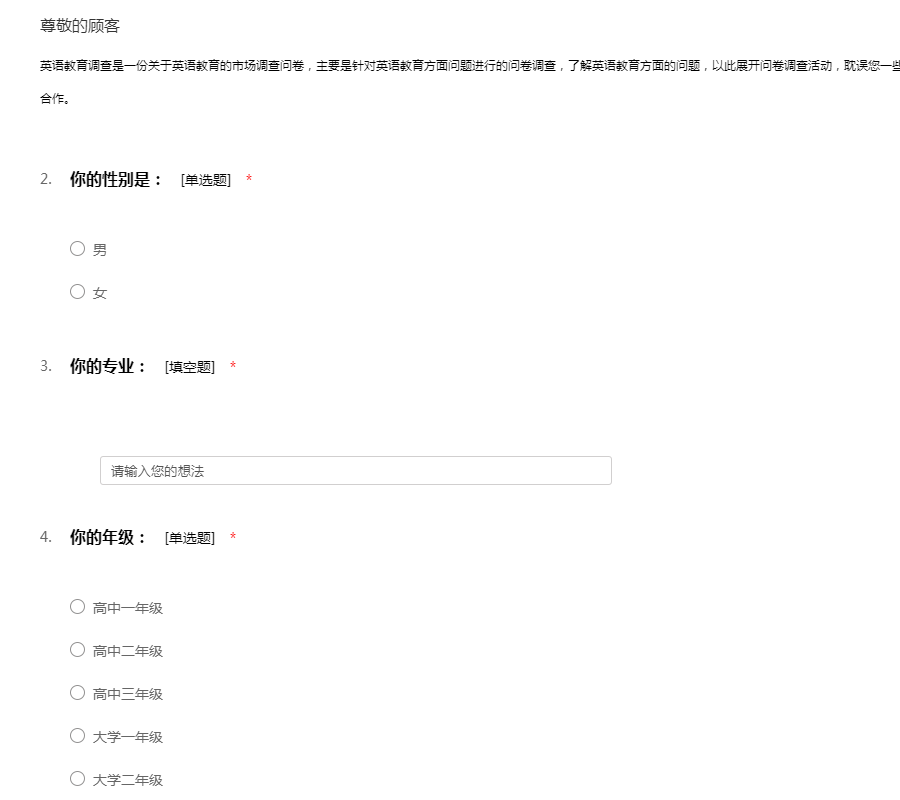 英语教育调查是一份关于英语教育的市场调查问卷,主要是针对英语教育方面问题进行的问卷调查,了解英语教育方面的问题,以此展开问卷调查活动,耽误您一些宝贵时间,回答英语教 育调查问卷,谢谢您的合作。