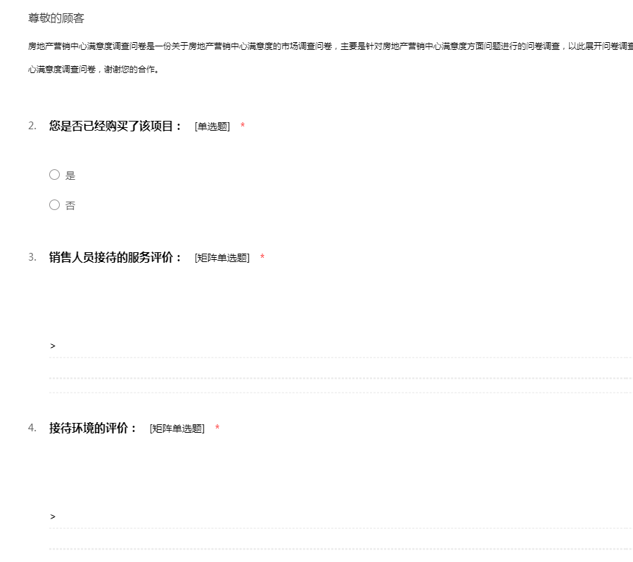 房地产营销中心满意度调查问卷是一份关于房地产营销中心满意度的市场调查问卷,主要是针对房地产营销中心满意度方面问题进行的问卷调查,以此展开问卷调查活动,耽误您一些宝贵时间,回答房地产营销中心满意度调查问卷,谢谢您的合作。