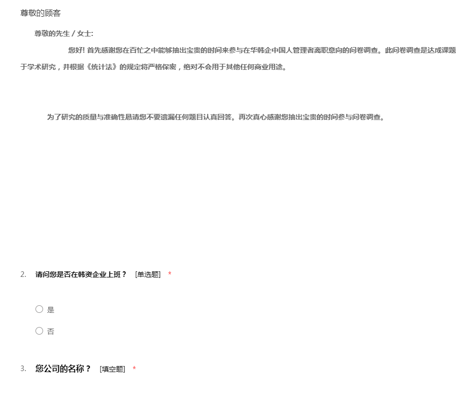 尊敬的先生/女士: 您好! 首先感谢您在百忙之中能够抽出宝贵的时间来参与在华韩企中国人管理者离职意向的问卷调查。此问卷调查是达成课题研究目的的重要组成部分。调查结果仅用于学术研究,并根据《统计法》的规定将严格保密,绝对不会用于其他任何商业用途。 为了研究的质量与准确性恳请您不要遗漏任何题目认真回答。再次真心感谢您抽出宝贵的时间参与问卷调查。 2014年3月 韩国启明大学 大学院经营学科 联络方式:Email:lindvall09@msn.com