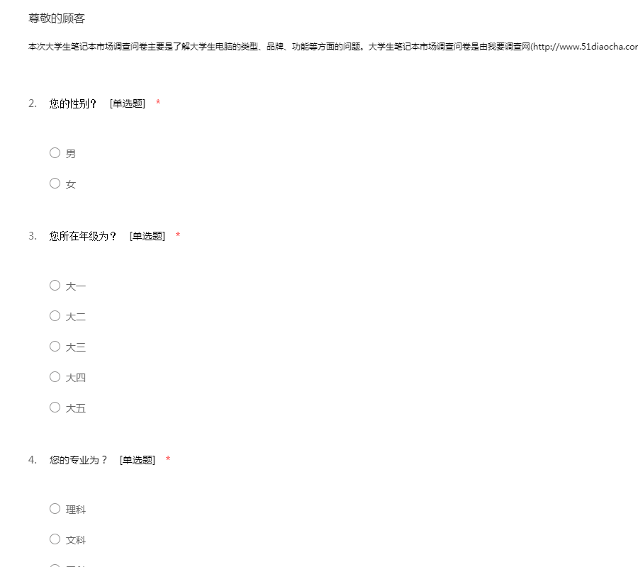 本次大学生笔记本市场调查问卷主要是了解大学生电脑的类型、品牌、功能等方面的问题。大学生笔记本市场调查问卷是由我要调查网(http://www.51diaocha.com)提供。