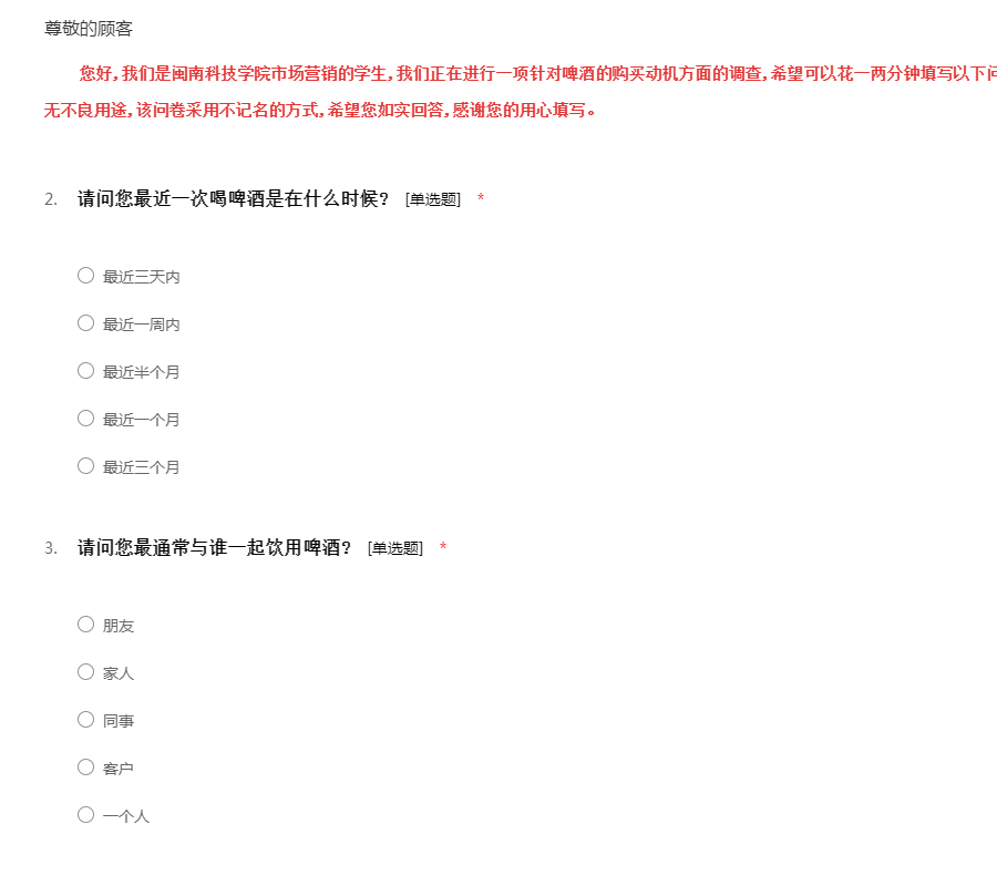 您好,我们是闽南科技学院市场营销的学生,我们正在进行一项针对啤酒的购买动机方面的调查,希望可以花一两分钟填写以下问卷。所收集的信息只做研究分析之用,无不良用途,该问卷采用不记名的方式,希望您如实回答,感谢您的用心填写。