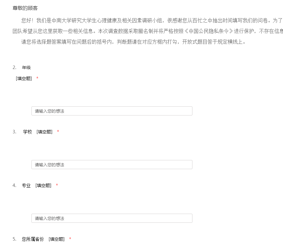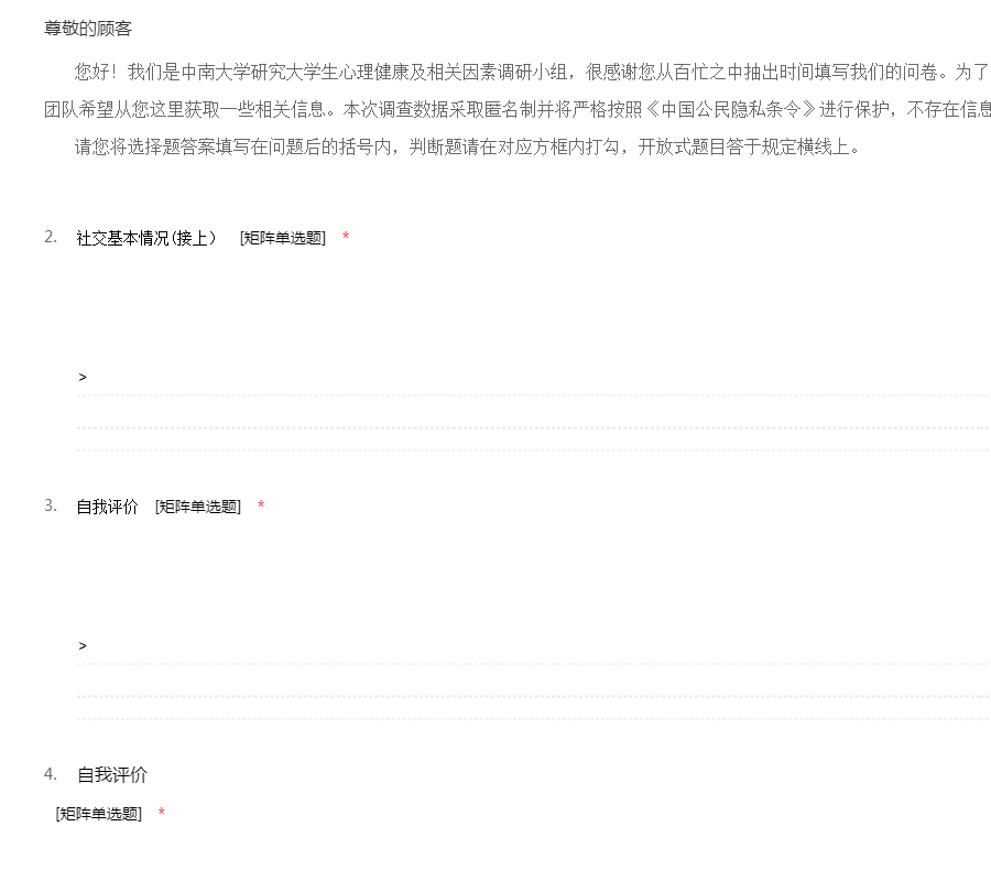 您好!我们是中南大学研究大学生心理健康及相关因素调研小组,很感谢您从百忙之中抽出时间填写我们的问卷。为了了解大学生大学生活适应状况,我们团队希望从您这里获取一些相关信息。本次调查数据采取匿名制并将严格按照《中国公民隐私条令》进行保护,不存在信息泄露的风险,您可以放心作答。 请您将选择题答案填写在问题后的括号内,判断题请在对应方框内打勾,开放式题目答于规定横线上。