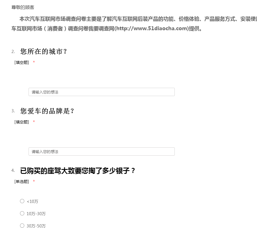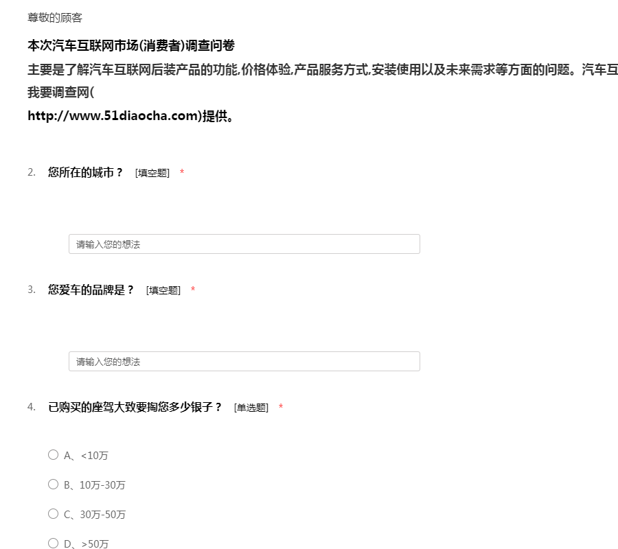 本次汽车互联网市场(消费者)调查问卷主要是了解汽车互联网后装产品的功能,价格体验,产品服务方式,安装使用以及未来需求等方面的问题。汽车互联网市场(消费者)调查问卷是由我要调查网(http://www.51diaocha.com)提供。